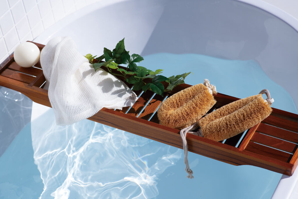 健康たわしで身体を洗う時は、心臓から遠い血行が悪くなりやすい場所、足の指、足のウラ、手のひらからリンパの流れにあわせて心臓に向かってこすります。初めての方はやわらかい繊維を使用した「サトオさん」シリーズで踵など、皮膚の厚い部分からはじめましょう。